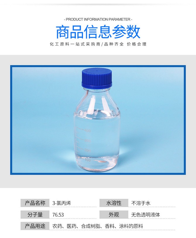 2.兼有烯烴和鹵代烴的反應(yīng)性,是甘油、環(huán)氧氯丙烷、丙烯醇等的有機(jī)合成中間體。也用于農(nóng)藥、醫(yī)藥的原料。還可用作合成樹脂、涂料、粘結(jié)劑、增塑劑、穩(wěn)定劑、表面活性劑、潤(rùn)滑劑、土壤改良劑、香料等精細(xì)化學(xué)品的原料,主要用于制造環(huán)氧氯丙烷、甘油、氯丙醇、丙烯醇、農(nóng)藥殺蟲雙、醫(yī)藥、樹脂、涂料、粘合劑,以及丙烯磺酸鈉,潤(rùn)滑劑等。